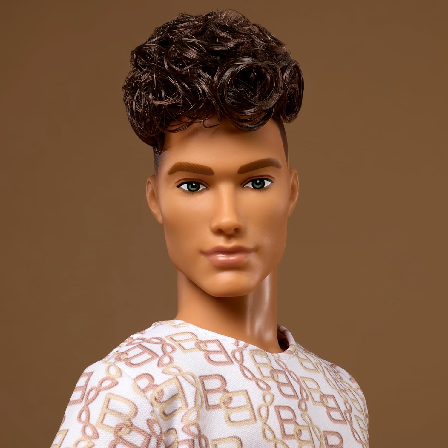 Ken doll from Barbie Basics Model 10 nabs the monoprint look in a t-shirt, shorts, and brown sandals with a matching chain-inspired print. His brunette hair is styled in a cool long-top cut. His one-size-fits-all dolls outfit is made of premium stretchable fabric.