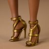 Barbie Basics Model 09 doll is eye-catching in a shimmery golden dress with empire waist and matching strappy heels.