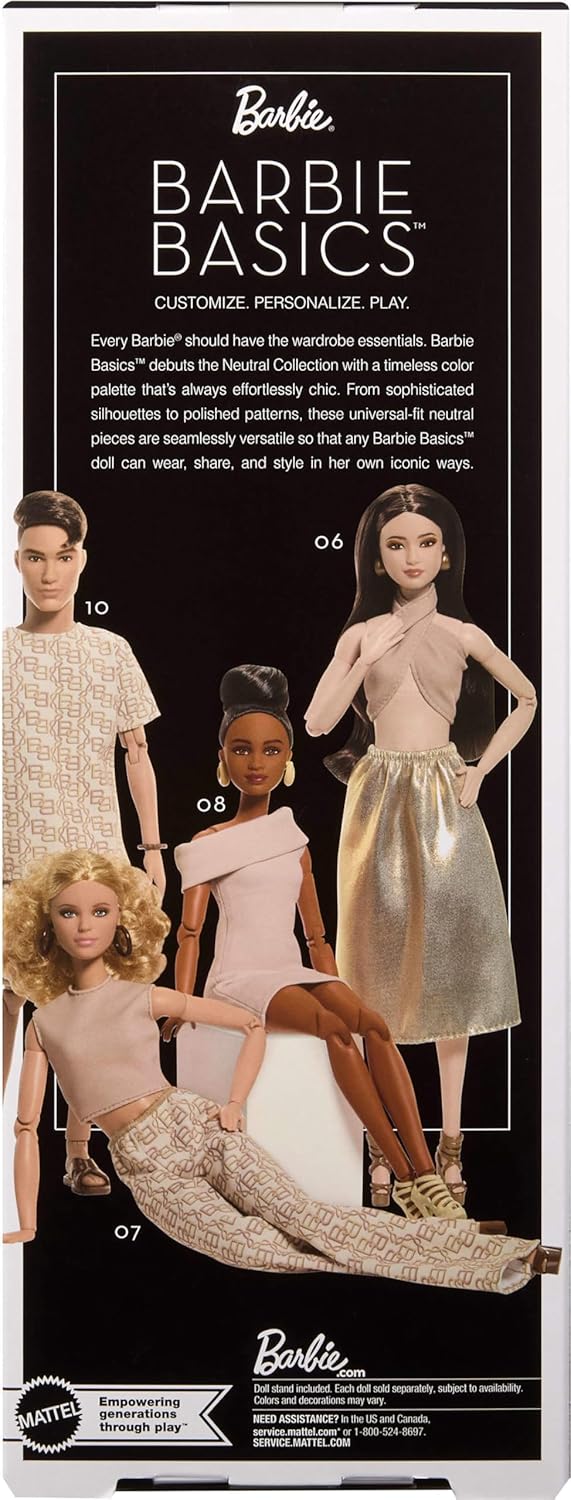 Barbie Basics Model Collector Fashion Doll 09 with Brunette Hair in Golden Dress & Strappy Heels, Universal-fit Fashions & Posable Body