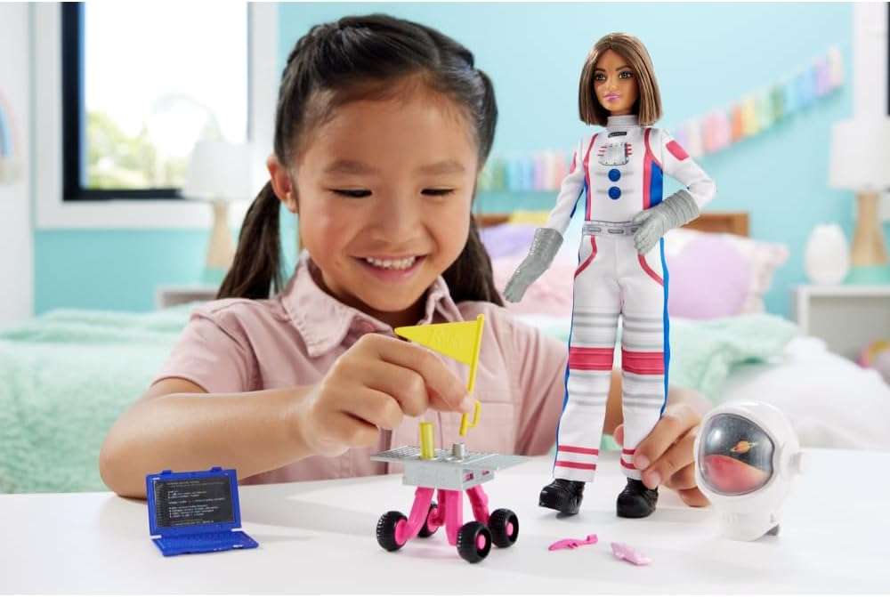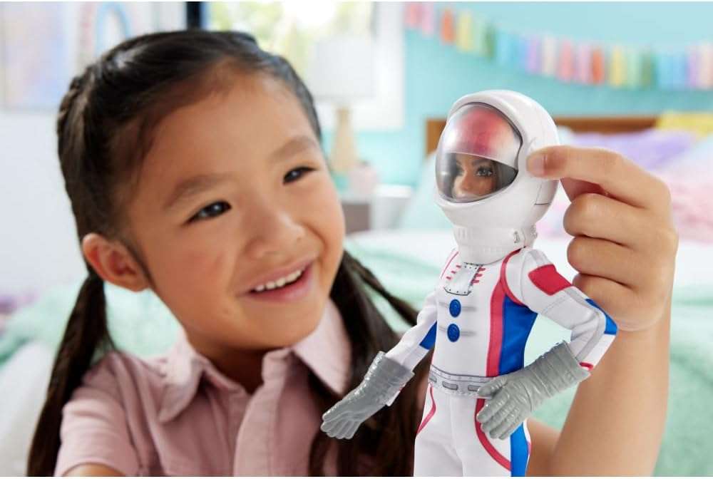 A collection of fashion dolls highlighting fan-favorite careers, such as this astronaut set, celebrate Barbie doll’s 65th anniversary. Barbie doll wears a spacesuit with iconic pink touches and comes with 10 themed accessories, including a view-changing helmet and rolling space rover! Kids can pretend and have big dreams; collectors will want all of them! Each doll sold separately, subject to availability. Dolls cannot stand alone. Colors and decorations may vary.