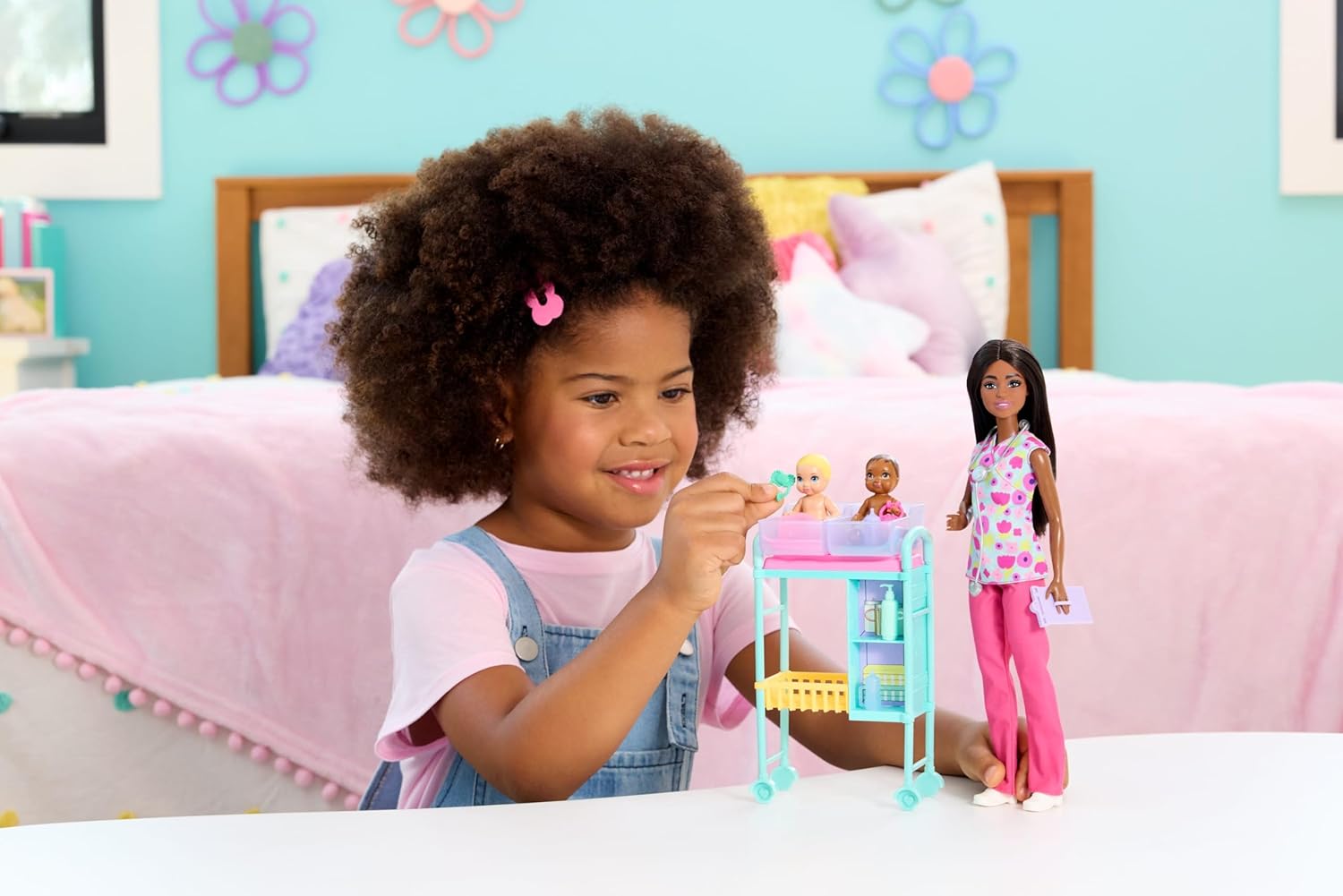 Included Components: Includes Barbie doll wearing removable scrubs and shoes, 2 baby dolls, 1 examination table, 2 bottles, 2 pacifiers, 1 lotion bottle, 2 blankets and 1 stethoscope.