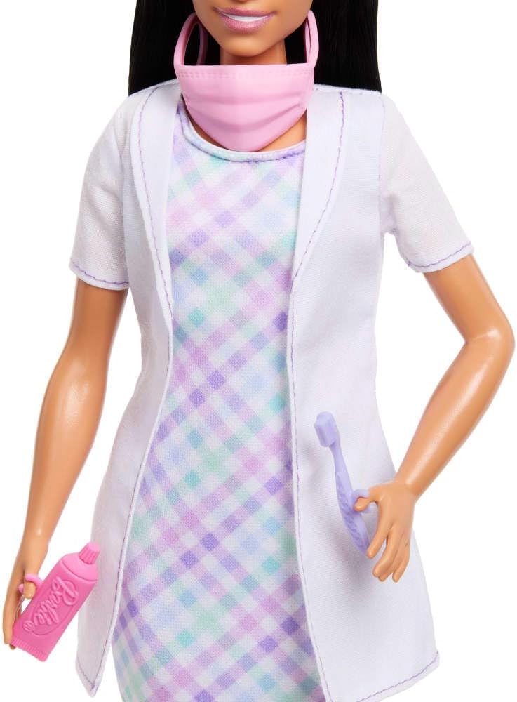 Included Components: Includes Barbie doll wearing removable white coat, dress and shoes, 1 toddler doll, 1 examination chair, 2 tools, 1 toothbrush, 1 tube of toothpaste, 1 mask, 1 pair of glasses, 1 teddy bear and 1 set of model teeth.