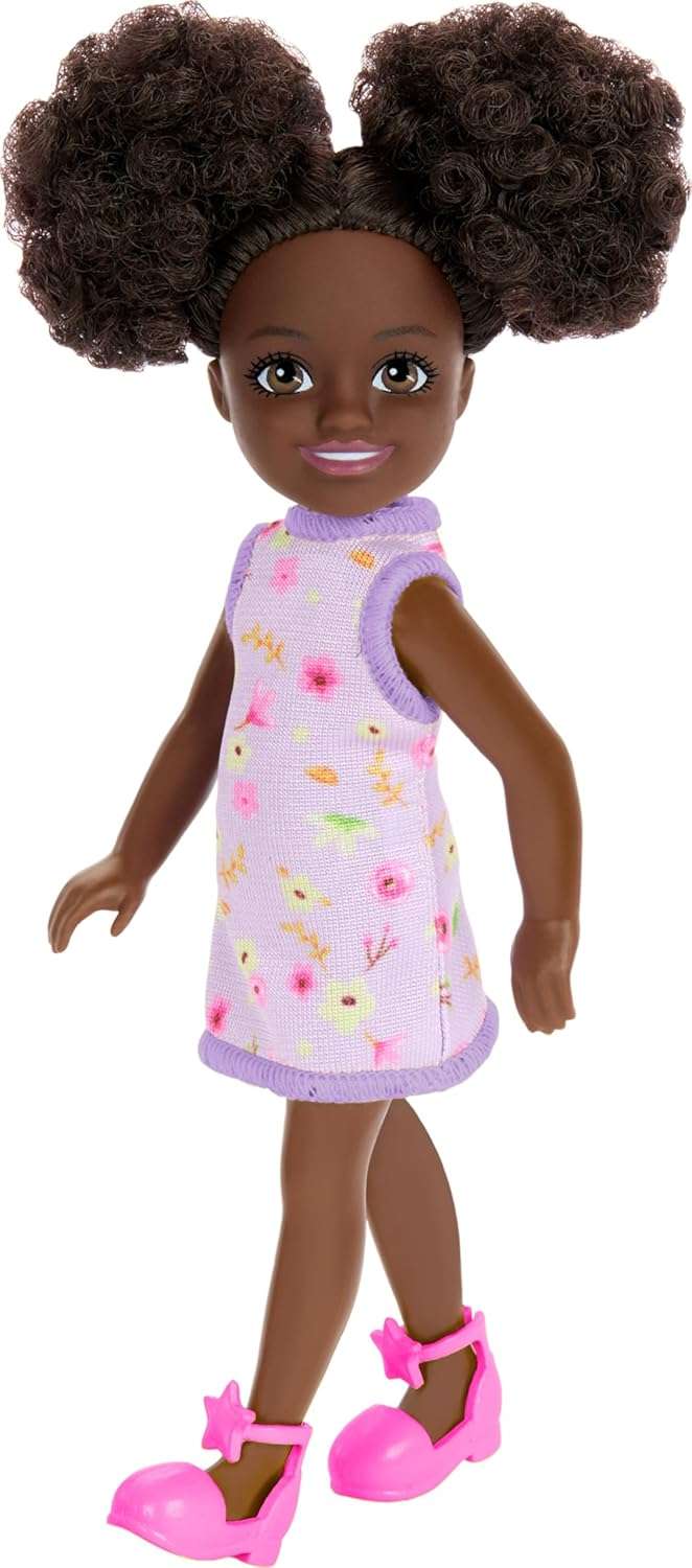 Barbie Chelsea Doll, Small Doll Wearing Removable Purple Floral Dress & Pink Shoes with Space Buns & Brown Eyes