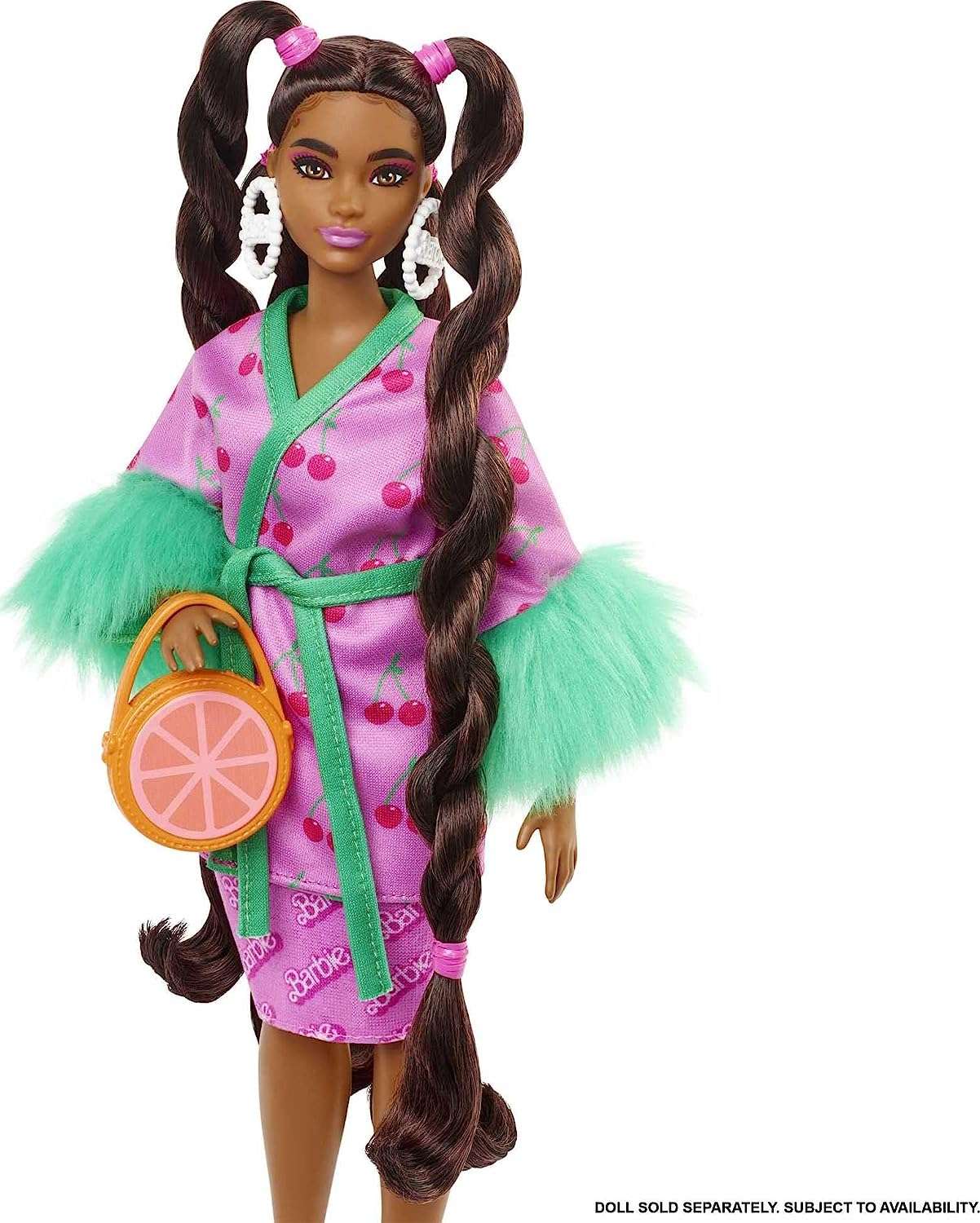 Children can carry much more Additional energies to their Barbie dolls’ looks with a cherry-print kimono with shaggy sleeves and an orange cut propelled purse.