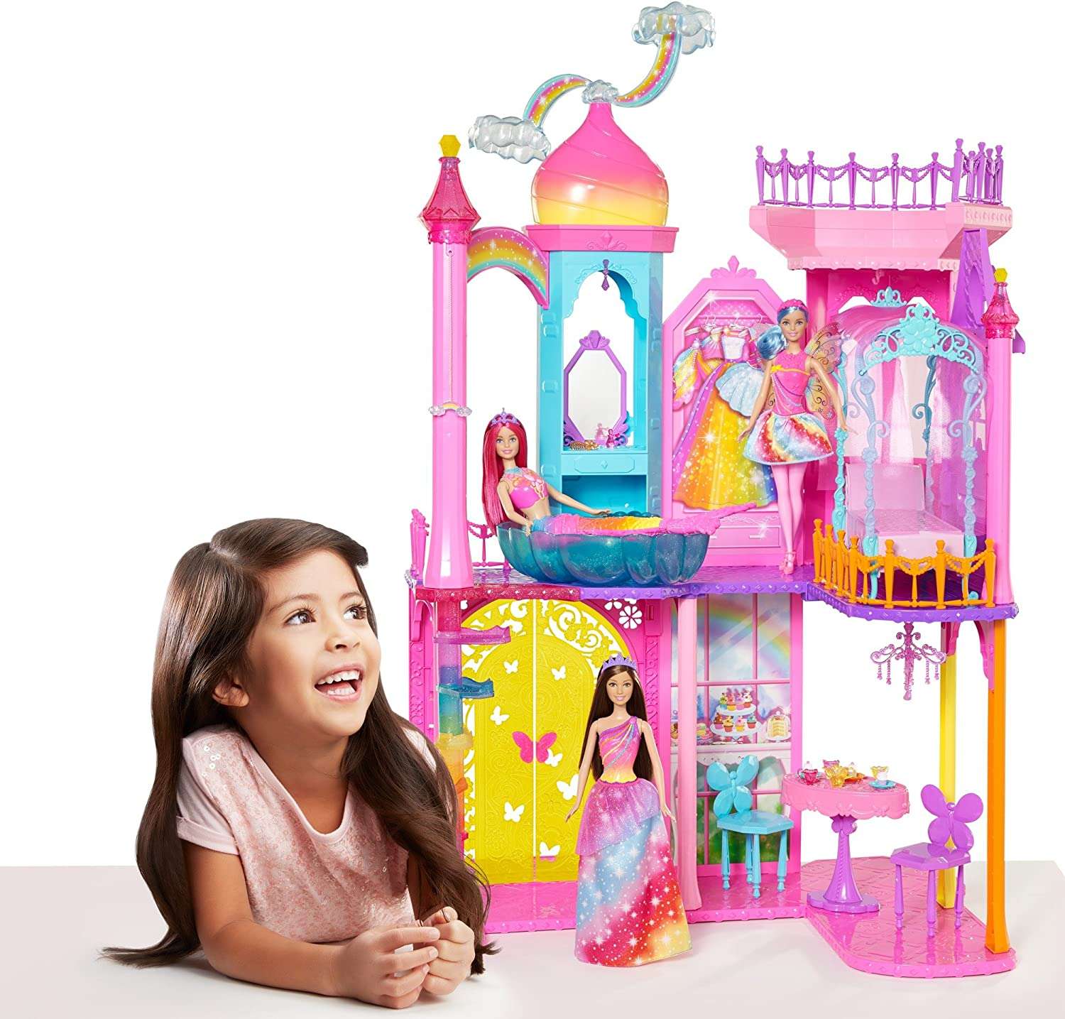 Get In the Rainbow Cove with the Barbie rainbow castle. 3 colorful floors highlight the rainbow style with brilliantly colored backdrops, information as well as accessories. Colorful turrets, intermediaries of butterflies in the door as well as rainbows everywhere make this castle magical! At the top, sparkly clouds can hold a fairy doll as she spins and forgets the entire cove (dolls sold individually). It’s a magical touch that includes rising narration enjoyable! For timeless home play, enter the Barbie castle via the colorfully embellished double doors to find a dining-room with a table set for two– the adorable chairs have actually shaped backs motivated by the princesses, mermaids and also fairies of the kingdom, like a butterfly as well as blossom. A glam light fixture awaiting the dining-room adds an imperial touch. Take the rainbow-colored stairways to the second flooring to use the vanity, storage room as well as room. The stunning canopied bed with its purple cushion is perfect for pleasant dreams! A shell-shaped mermaid swimming pool creates outside area below, while a roof deck is a wonderful area for tea. Talk sort of fairy tales with this vibrantly colored rainbow castle– the possibilities for activity, experience and also gladly ever after’s are limitless! The Barbie rainbow castle functions spinning clouds and includes a mermaid pool, a dining table, a tea table, 2 chairs, a canopied bed, cushion, tea cups, cupcakes on plates, perfume bottle and also brush. Doll not included. Shades and decors might differ.
