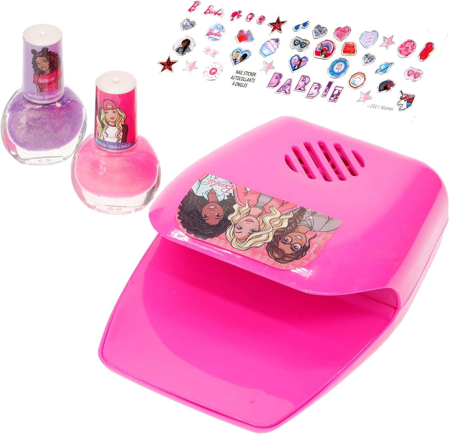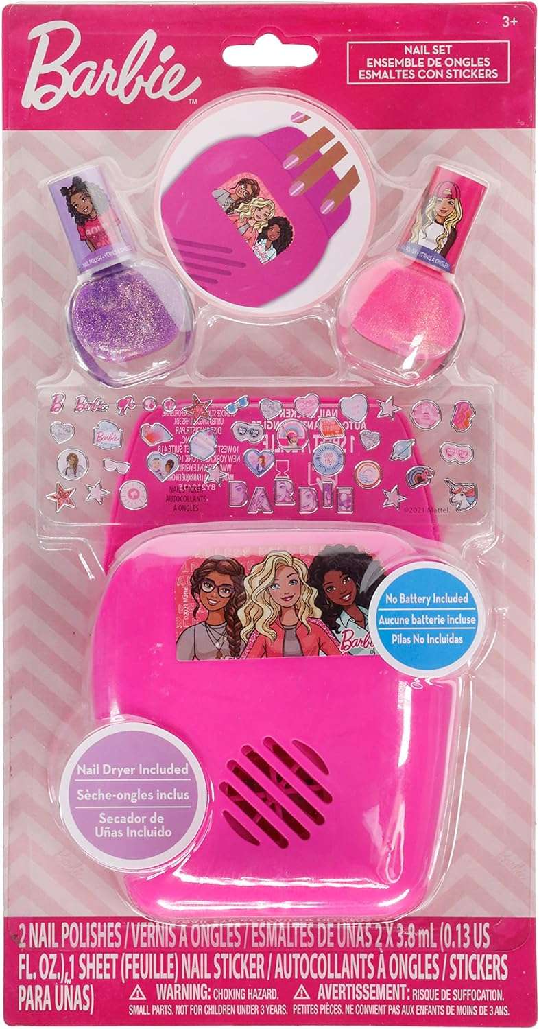 INCLUDED WITH THE Acquisition OF BARBIE Youngsters NAIL Clean AND DRYER Unit – Incorporates 2 Nail Shines 1 Nail Dryer and 42 Nail Stickers. This Barbie set of youngster nails clean and stickers for young ladies accompanies a wonderful plan and highlights your little one’s number one characters from the Barbie motivating dolls universe. The beautiful young ladies nail clean set for youngsters accompanies its own nail dryer for fast and simple use. Suggested for youngsters ages 3 and up.