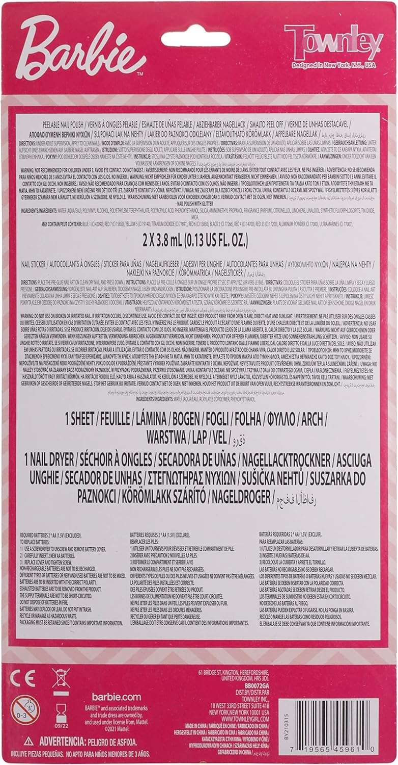Barbie – Townley Girl Non-Toxic Peel-Off Nail Polish Set with Nail Dryer for Girls, Batteries Not Included, Ages 3+