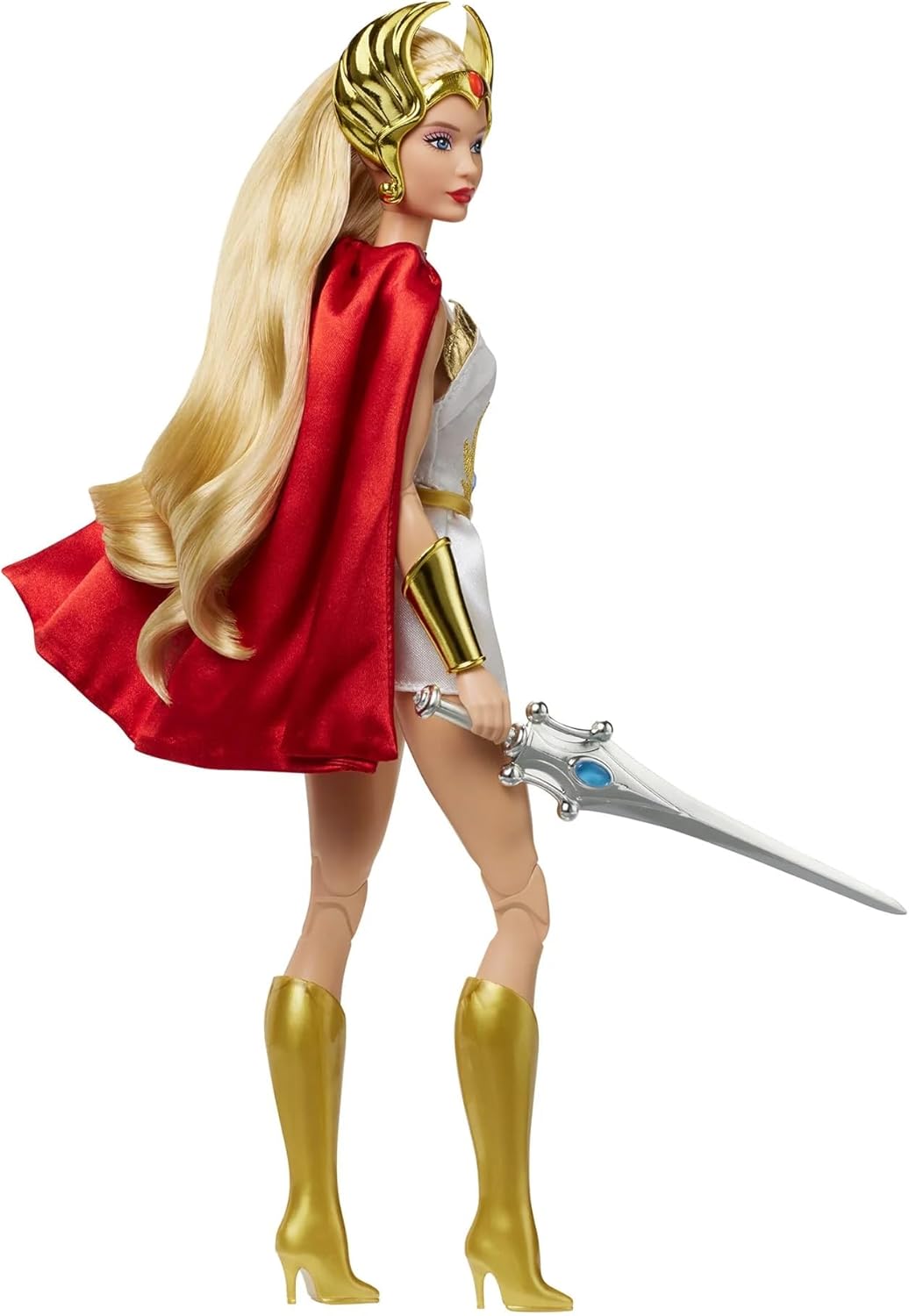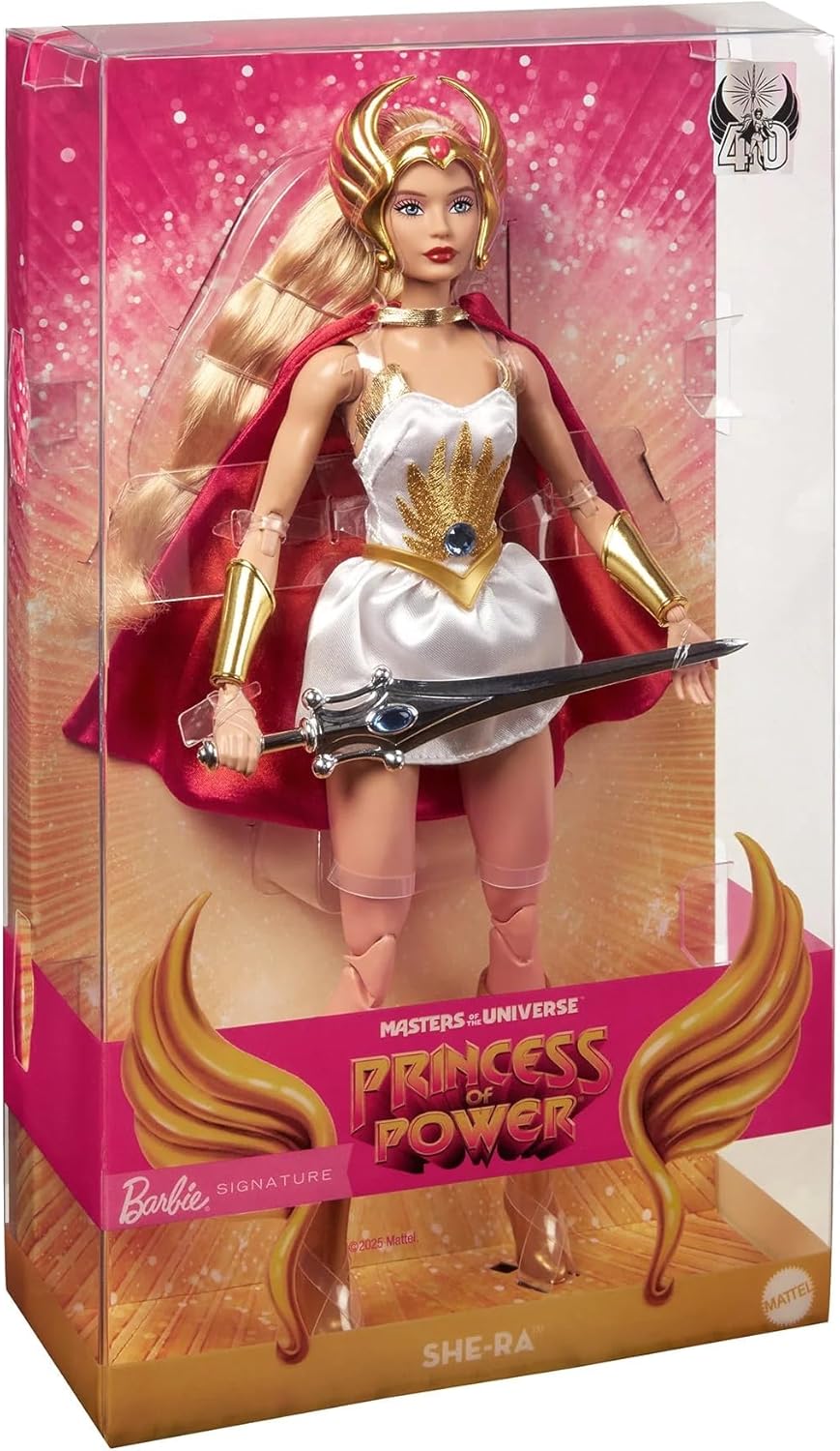 The world of Barbie just got a whole lot more heroic. This year marks the 40th anniversary of the legendary She-Ra, Princess of Power, with a one-of-a-kind tribute: her first appearance as a Barbie doll. She-Ra is bigger than life, and she is wearing her signature satiny white dress, golden boots, winged headpiece, flowing red cape, and her Sword of Protection to protect Eternia from the evil Horde.