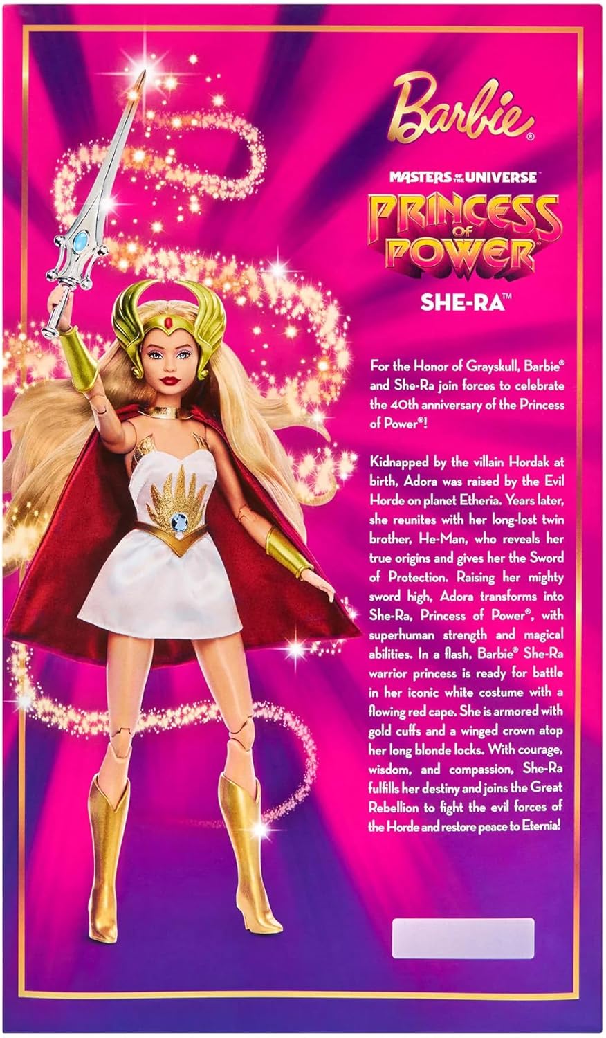 Celebrates the 40th anniversary of She-Ra, Princess of Power by reimagining her as her first Barbie collectible doll with heroic details and premium finishes.